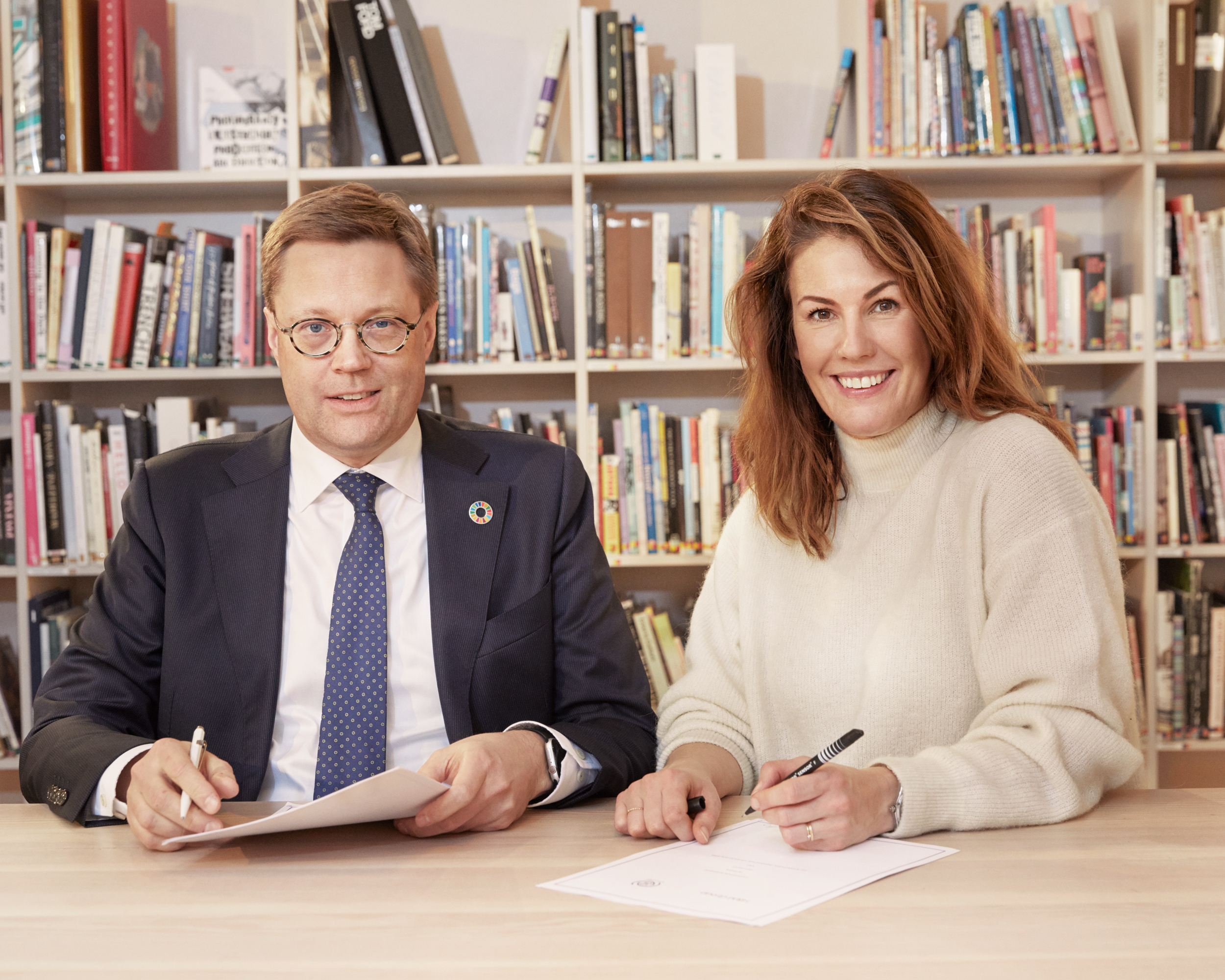 IOM Finland Chief of Mission Simo Kohonen and H&M Group’s Head of Sustainability Anna Gedda today signed an MoU to Promote Ethical Recruitment and the Protection of Migrant Workers. Photo: IOM